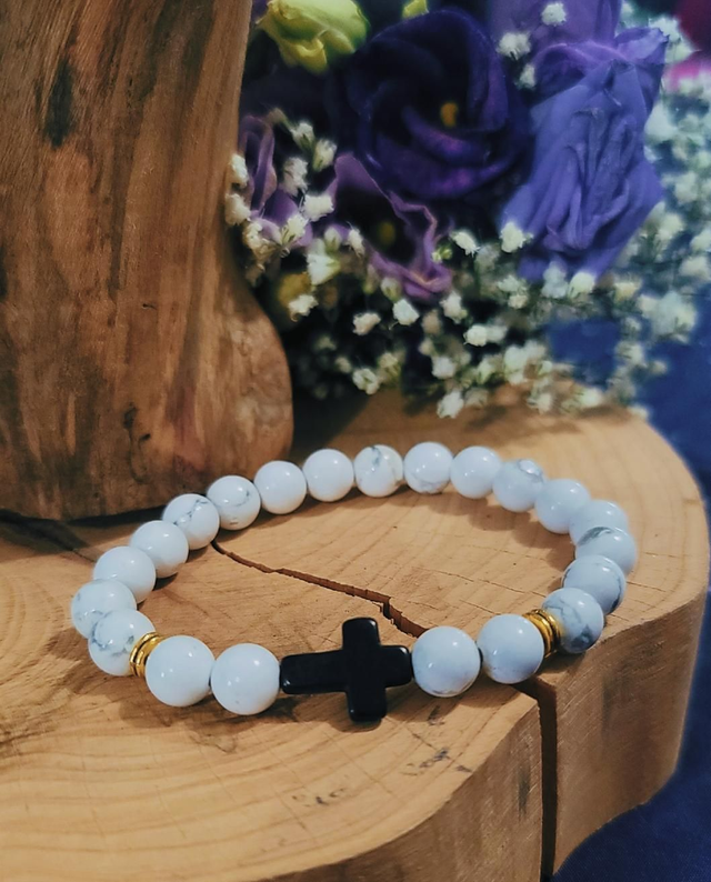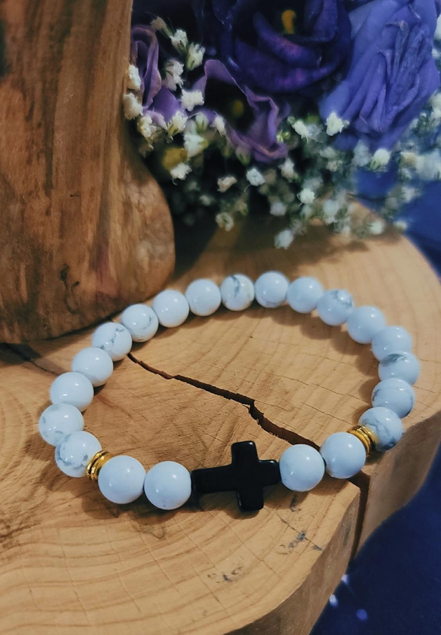 Ce bracelet unique associe la pureté de la howlite blanche à la force spirituelle d’une croix en bois noir. La howlite est une pierre de sérénité, réputée pour calmer l’esprit, apaiser les émotions et favoriser un sommeil réparateur. Elle aide à réduire le stress, l’anxiété et les pensées négatives en apportant douceur et équilibre intérieur. Pierre de sagesse et de patience, elle accompagne les périodes de changements et soutient la concentration lors des méditations ou prises de décision.