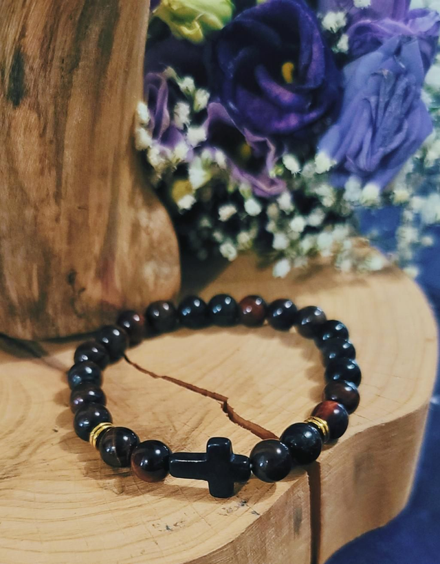 Ce bracelet puissant associe la force protectrice de l’Œil de Taureau à la symbolique spirituelle d’une croix en bois noir. L’Œil de Taureau, proche de l’Œil de Tigre, est une pierre de protection et de vitalité.