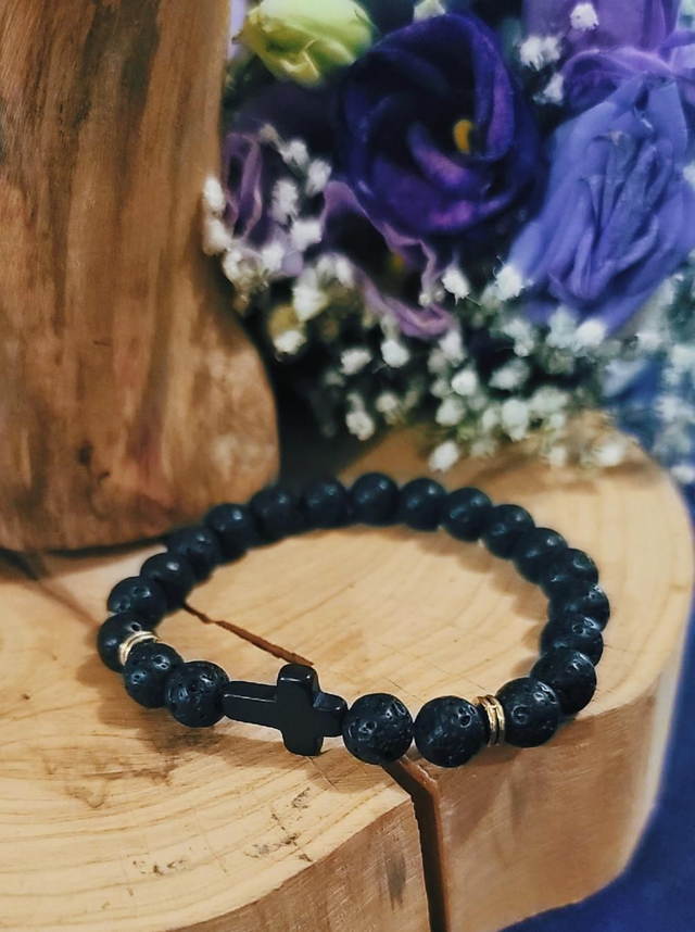 ✨ Bracelet Pierre de Lave avec Croix en Bois Noir ✨